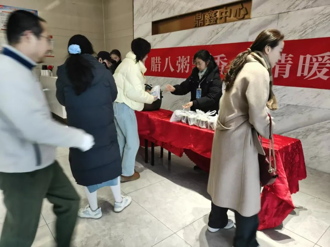 2025 年1月7日,臘八節當天,鼎鑫中心 A 座大廳內洋溢著溫暖與歡樂。佳旭物業精心籌備的 “暖心送粥 + 雞蛋” 活動在這里溫情上演,為每一位路過的業主送上了一份濃濃的節日關懷。