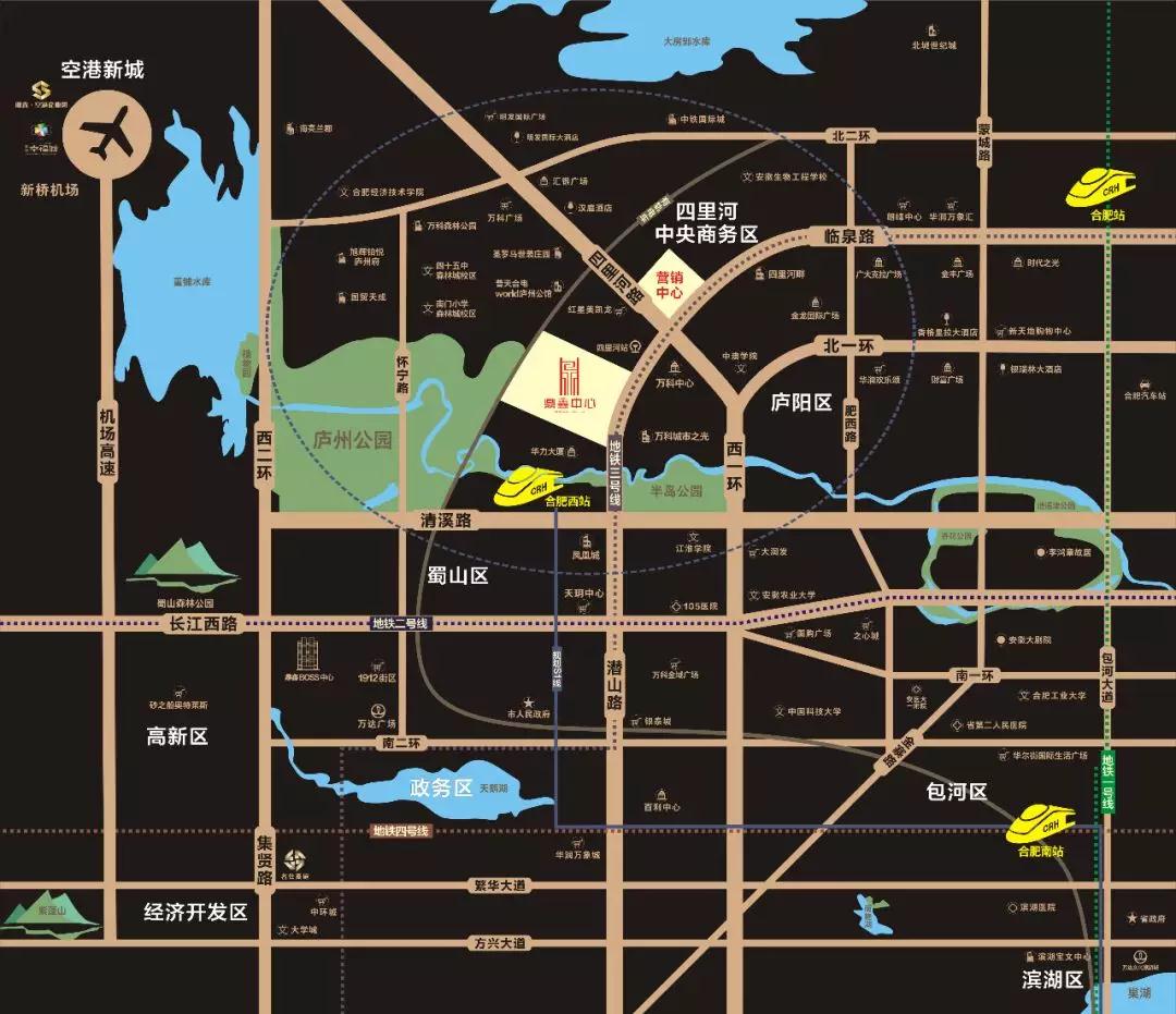【鼎鑫中心】毗鄰新高鐵西站,十余條高鐵線路于此匯合,通達全省并直連全國各大中心城市,項目正處于合肥市重點打造的合肥主城區“高鐵商務圈”核心區域,近享百萬高端商務人流,將打造成商務圈內最具盛名的商業中心。