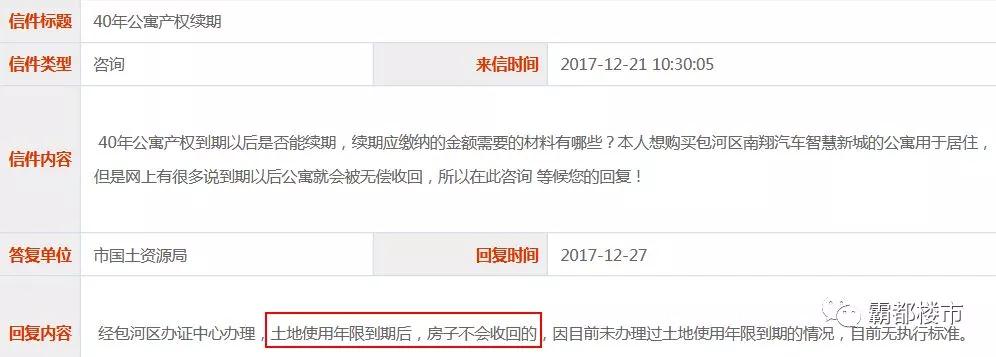 今天,在合肥12345上,合肥市國土資源局回復(fù)有關(guān)“40年公寓產(chǎn)權(quán)到期”的問題,表示:產(chǎn)權(quán)到期,房子不會收回。