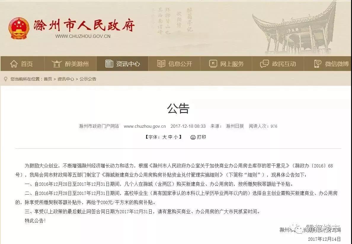 01 自2016年12月28日至2017年12月31日期間,凡個人在滁城(含兩區(qū))購買新建商業(yè)、辦公用房的,按所繳契稅等額給予補貼。